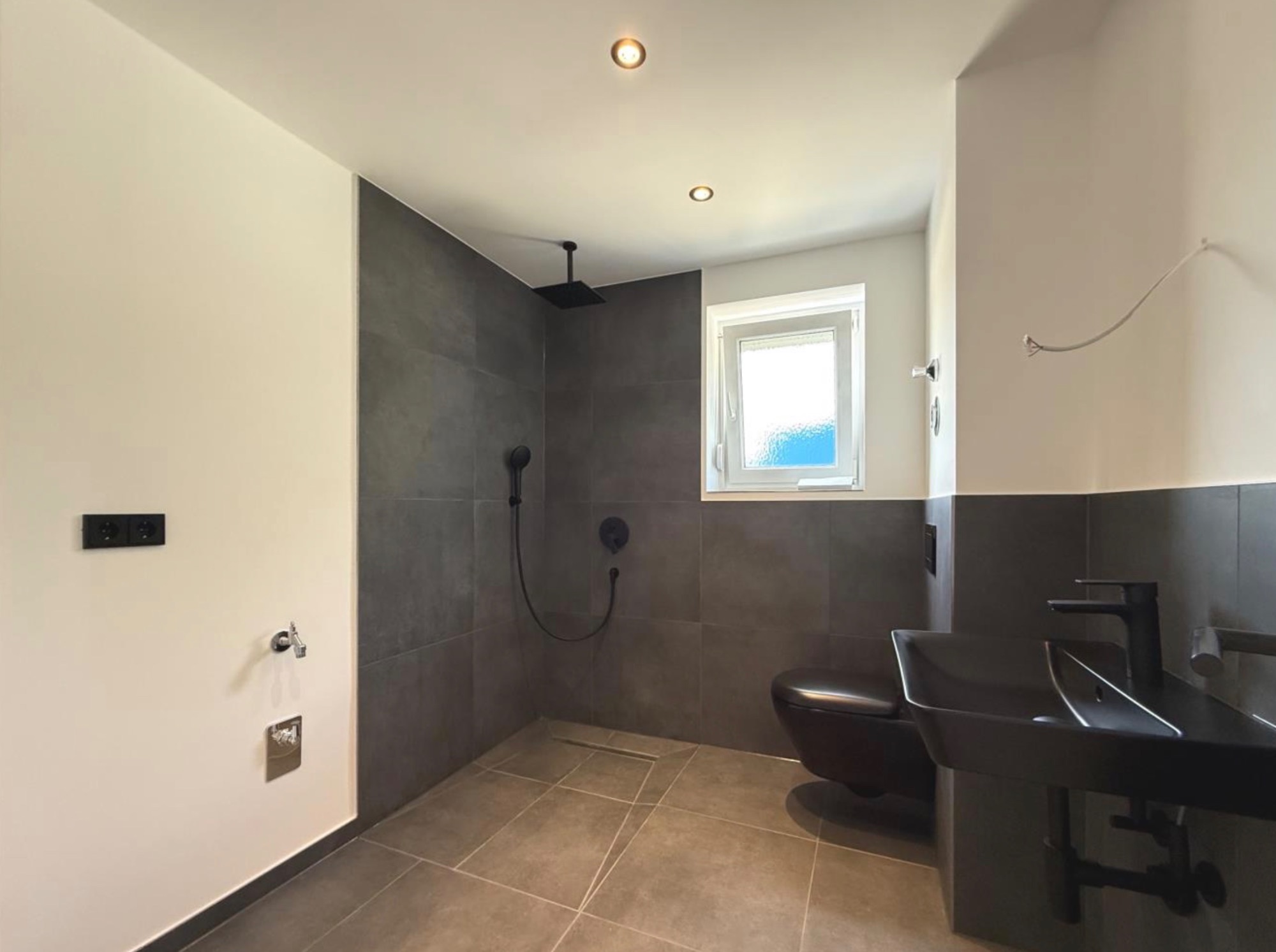 Großzügiges Bad mit großer begehbarer Dusche.